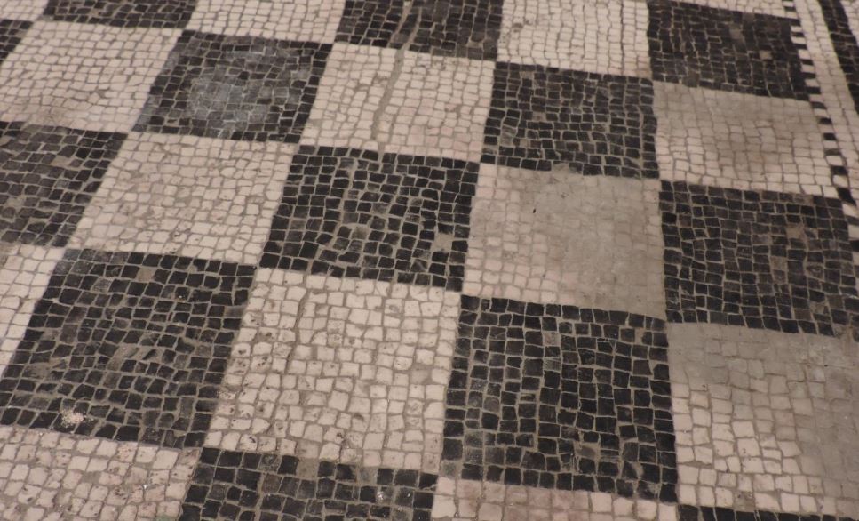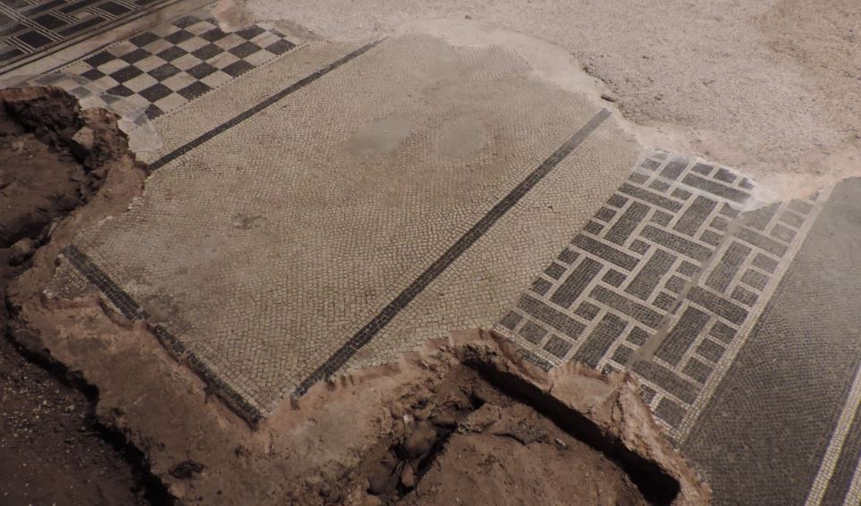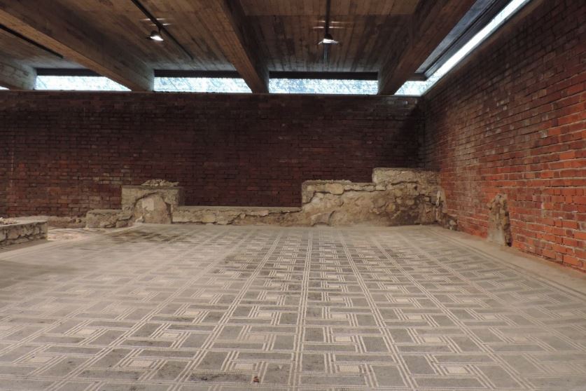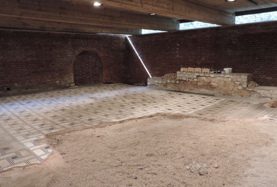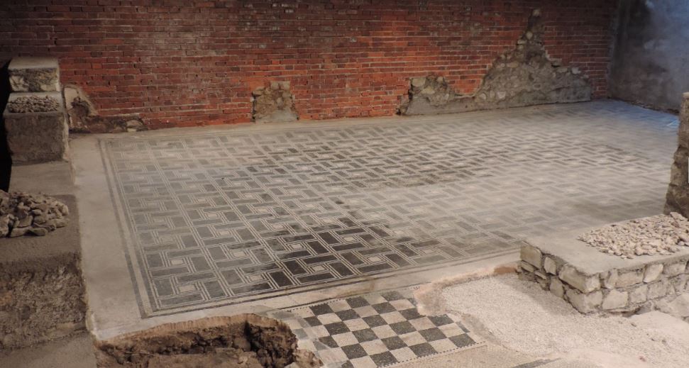 I due pavimenti presentano mosaici geometrici con motivi a stelle, scacchiere e rettangoli. I più grandi sono caratterizzati da un serrato ripetersi di motivi a ‘stuoia’ in bianco e nero che imitano i più costosi modelli in lastre di marmo, adoperati in genere negli edifici pubblici. Di grande eleganza formale il gioco di contrasti cromatici tra le due diverse risoluzioni compositive, in cui prevalgono il bianco sul nero e viceversa.